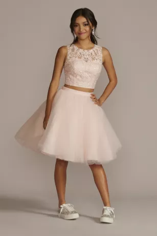 A modern quince dream! Start the day in this three-piece quinceanera ball gown, then shed the top skirt, revealing a flirty, poofy tulle skirt underneath. Features a cropped tank with lace appliques and a heart-shaped keyhole back.