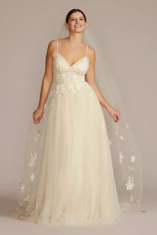You’ll radiate romance with the floral lace appliqued bodice on this dreamy full length gown, complete with chapel train.