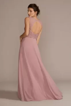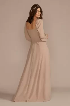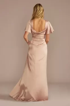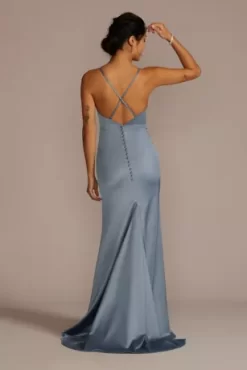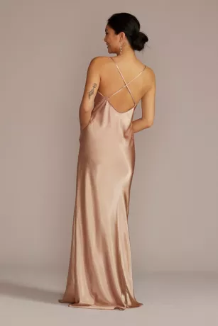 This long charmeuse bridesmaid dress elevates the simple slip dress with a cowl neck and crisscross back. Features adjustable straps and bra cups.
