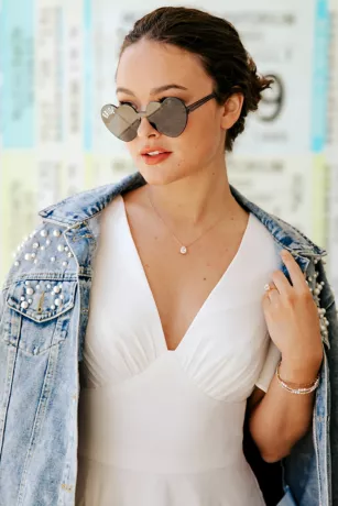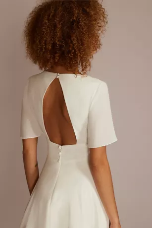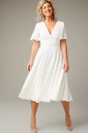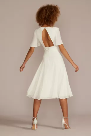 The chiffon flutter sleeves, empire waist, and open keyhole back make this midi-length dress timeless. Make it modern with a sparkly heel or keep it classic with a blusher veil and understated jewelry.