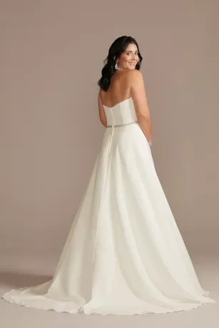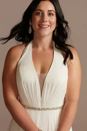With its illusion plunge neckline, this chiffon A-line wedding dress is simply stunning. An embellished belt at the waist, detailed with 15,000 beads, opals, and crystals, separates the pleated bodice from the soft flowy skirt.