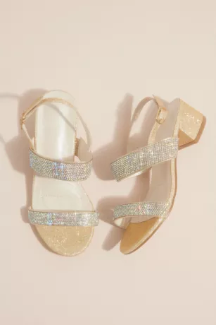 Make the flower girl sparkle with twinkle toes in these glittery block heel sandals topped with crystal embellishments.