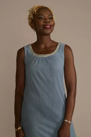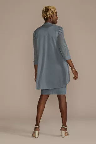 A sheer open-front jacket provides a hint of coverage atop this short, textured sheath dress. Beading at the neckline and a matching cuff detail add something special.