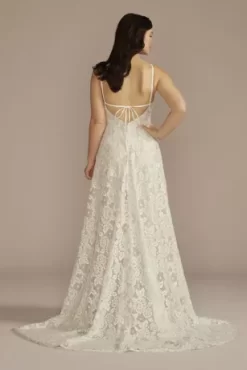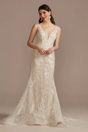 Covered with 7,000 beads, this sequin and lace wedding gown features boning at the bodice for beautiful shape, a plunging V-neckline, and power mesh lining for a comfortable fit. Horsehair trim at the hem gives the dress dreamy movement.
