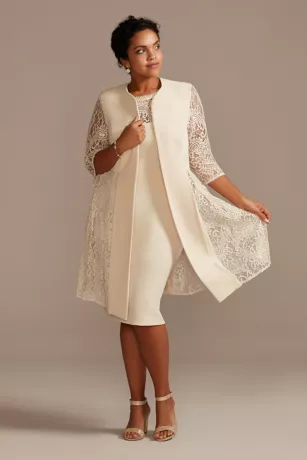 The fun and flirty length, removable jacket, lace detail, and illusion neckline mean this short crepe dress and jacket set is perfect for any occasion.