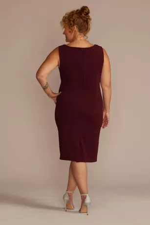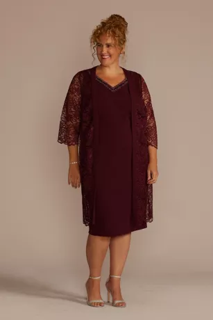 This knee-length plus-size sheath dress is detailed with a beaded V-neckline and comes with a matching jacket featuring sheer three-quarter sleeves.