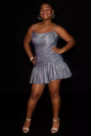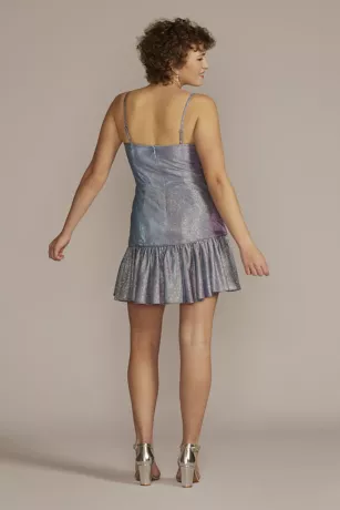 A playful, flouncy asymmetrical hem balances a structured square neckline on this metallic A-line dress. Pair with shining accessories for a full glam look, or wear simple add-ons to let the dress have its own moment.