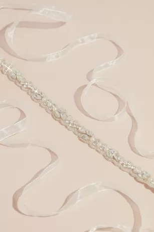 Add some shimmer to your wedding day look with this slender sash, crafted of crystals and rhodium and tied with a pretty ribbon.