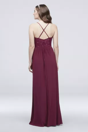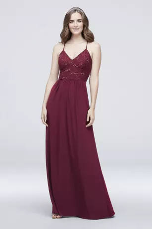 Sequins and lace adorn the bodice of this stretch jersey sheath dress, while crisscross spaghetti straps add interest at the back.