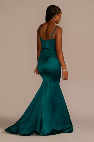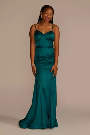 Sexy stretch satin shaped with a corset bodice and mermaid silhouette makes this prom-ready dress the stuff of legends. Seriously…get ready to be the talk of the hallway after wearing this number!