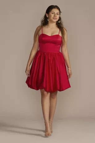 A modern bubble-hem skirt gives this short, satin A-line dress a flirty finish. Stash all your homecoming essentials in the handy pockets.